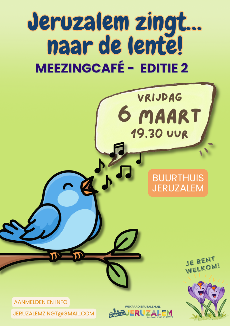 Extra leuk: deze editie wordt georganiseerd door vier buurtbewoners. Aanmelden: via: jeruzalemzingt@gmail.com. Er ligt dan een mooie liedjesmap voor je klaar. We zorgen voor lekkere borrelhapjes en een gratis drankje om de keel te smeren. Spontaan binnenlopen mag natuurlijk ook.